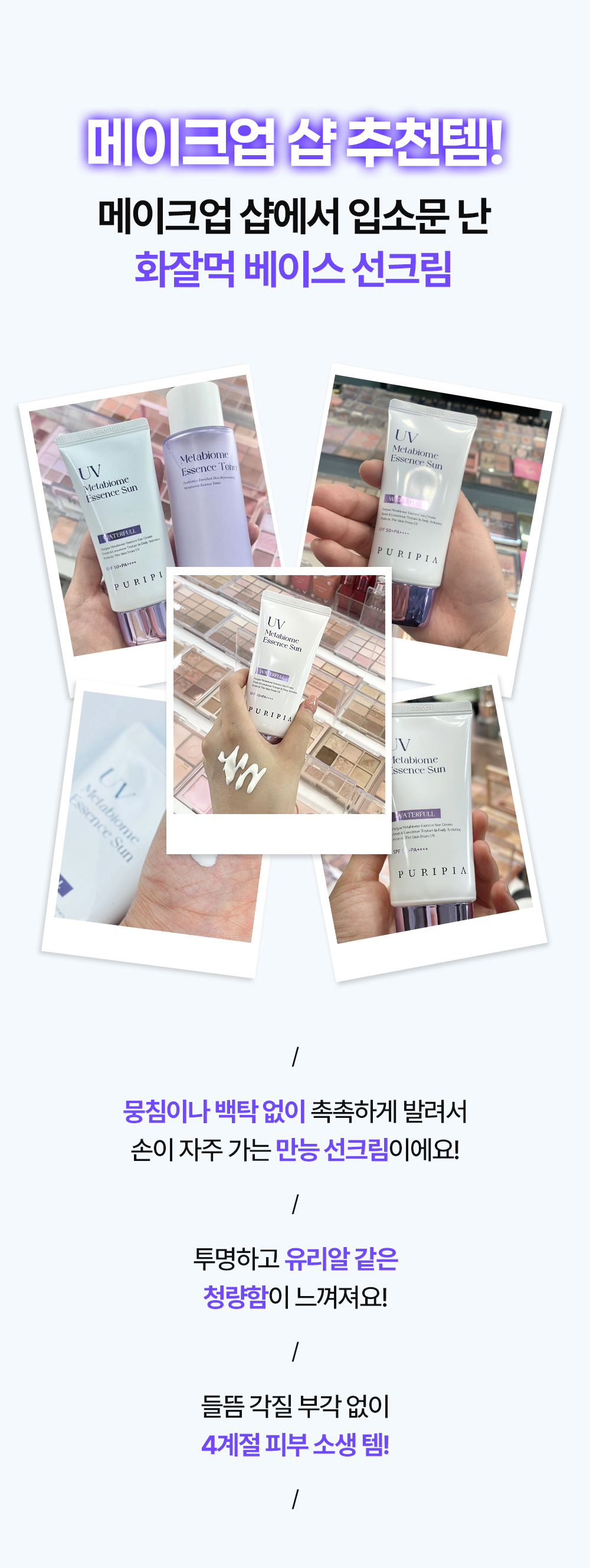 메이크업 샵 추천템! 유산균 화잘먹 선크림! 메이크업 베이스로 사용시 피부를 촉촉하고 산뜻하게 유지시켜줍니다.