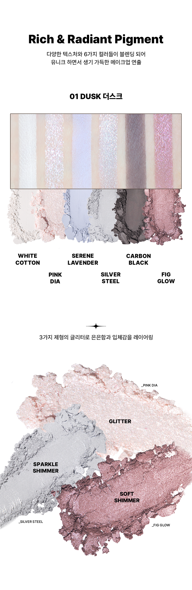 마이카 (CI 77019), 티타늄디옥사이드 (CI 77891), 칼슘알루미늄보로실리케이트, 탤크, 에칠헥실팔미테이트, 합성플루오르플로고파이트, 디이소스테아릴말레이트, 보론나이트라이드, 칼슘카보네이트, 디메치콘, 마그네슘미리스테이트, 나일론-12, 실리카, 흑색산화철 (CI 77499), 망가니즈바이올렛 (CI 77742), 적색산화철 (CI 77491), 울트라마린 (CI 77007), 마그네슘스테아레이트, 카프릴릴글라이콜, 글리세릴카프릴레이트, 카민 (CI 75470), 황색산화철 (CI 77492), 에칠헥실글리세린, 틴옥사이드 (CI 77861), 카올린, 알루미늄하이드록사이드, 트리에톡시카프릴릴실란, 말토덱스트린, 페릭페로시아나이드 (CI 77510), 토코페롤