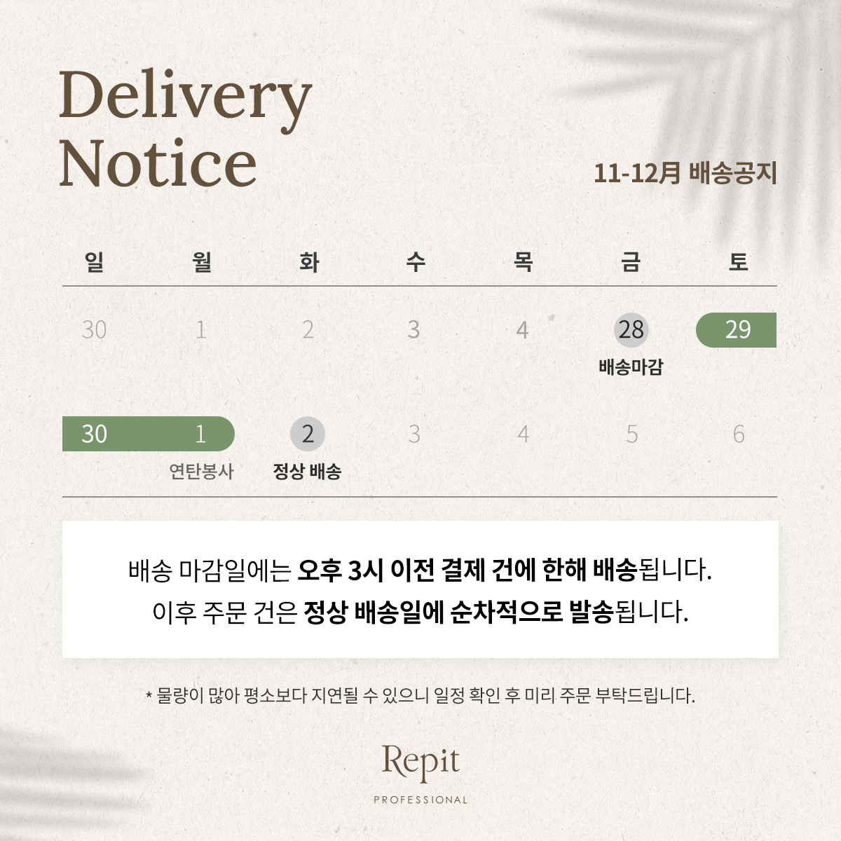 배송의 경우 지역과 배송사 상황에 따라 평균 2~3일 정도 소요되고 있으며 주말 및 공휴일은 헤메코를 포함한 물류지,택배사 휴무로 배송이 제한될 수 있습니다.