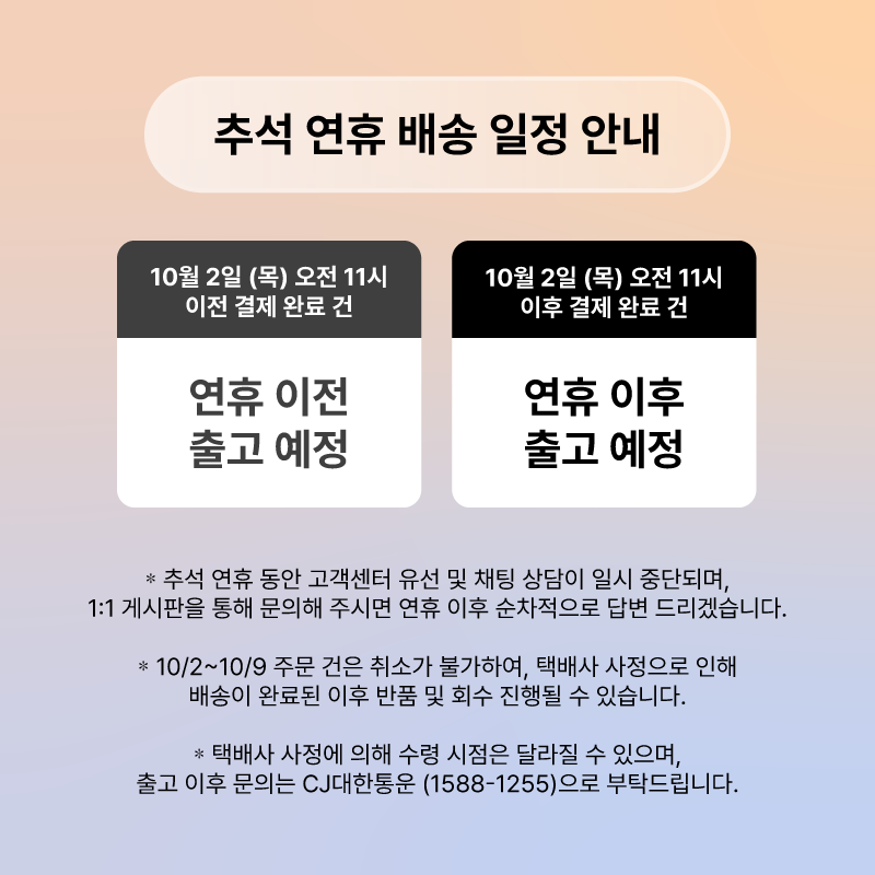 •제품 구매 후의 교환/환불/취소/반품 관련 문의는 마이페이지 > 1:1 문의를 통해 문의 바랍니다.