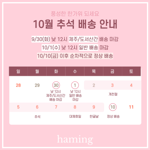 배송의 경우 지역과 배송사 상황에 따라 평균 2~3일 정도 소요되고 있으며 주말 및 공휴일은 헤메코를 포함한 물류지,택배사 휴무로 배송이 제한될 수 있습니다.