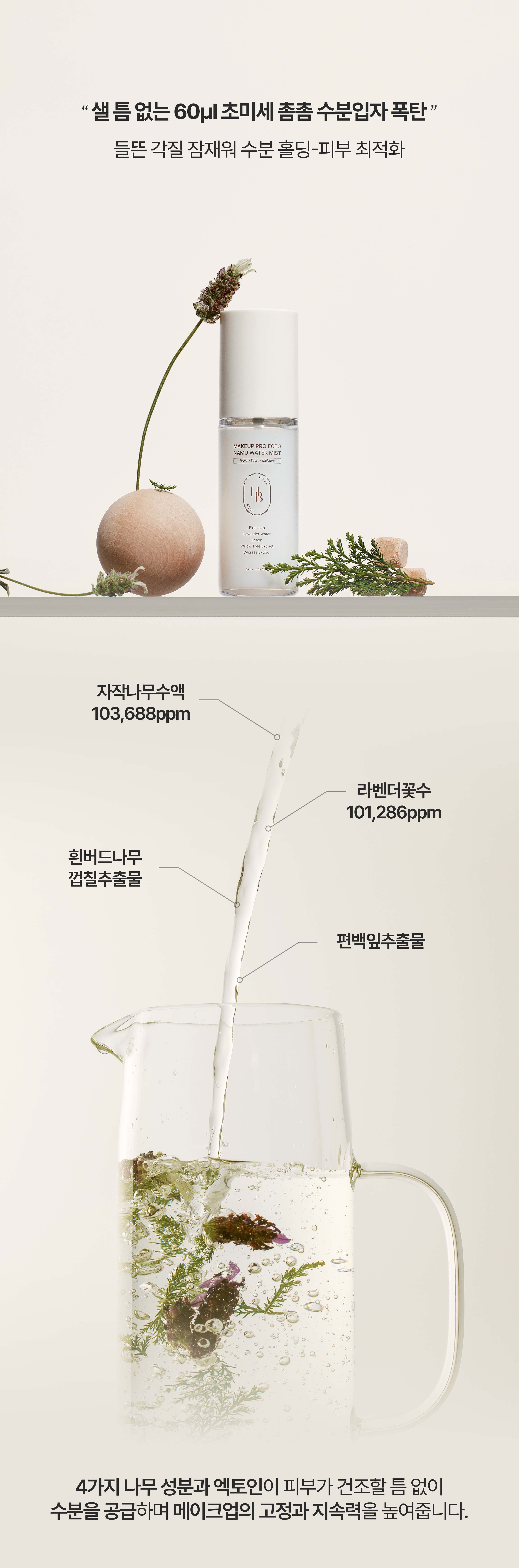 4가지 나무 성분과 엑토인이 피부가 건조할 틈 없이 수분을 공급하며 메이크업의 고정과 지속력 UP
